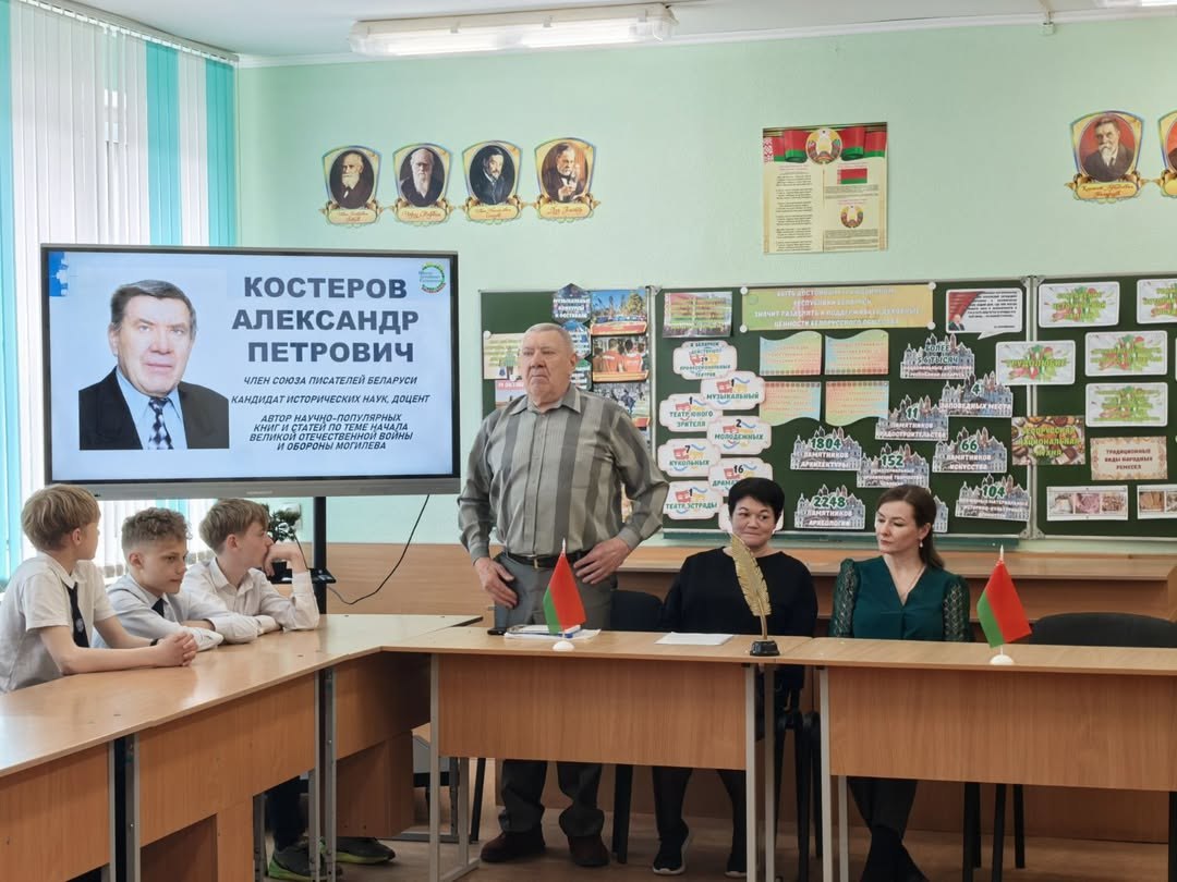 В качестве приглашенных гостей выступили Костеров Александр Петрович, член союза писателей Беларуси, кандидат исторических наук, доцент, автор научно-популярных книг и статей по теме начала Великой Отечественной войны и обороны Могилева и Северинцева Наталья Николаевна, заведующий библиотекой школы.
